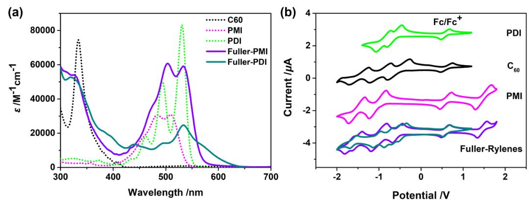 進(jìn)一步對其紫外-可見吸收光譜和電化學(xué)性質(zhì)進(jìn)行了研究(圖3)。Fuller-PMI的吸收光譜主要是子單元PMI和C60的光譜的疊加,在400-600 nm的可見光區(qū)表現(xiàn)出增強(qiáng)的吸光能力,且最大吸收峰較母體PMI紅移了25 nm,這主要?dú)w因于“軌道分區(qū)”后C60到PMI的推拉電子效應(yīng)。相較而言,由于分子內(nèi)較強(qiáng)的電子耦合作用,F(xiàn)uller-PDI在400-650 nm區(qū)域展現(xiàn)出寬而復(fù)雜的吸收峰。此外,實(shí)驗(yàn)獲得的前線軌道能級(jí)與理論計(jì)算的結(jié)果相吻合,F(xiàn)uller-PMI的HOMO/LUMO能級(jí)分別接近PMI和C60,而Fuller-PDI的LUMO能級(jí)低至-3.88 eV,說明具有較強(qiáng)的電子親和勢。