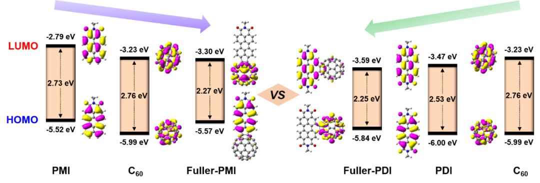 密度泛函理論計(jì)算表明,兩個(gè)分子展現(xiàn)出完全不同的軌道分布。通過peri位稠合的Fuller-PMI表現(xiàn)出明顯的“軌道分區(qū)”性質(zhì),即HOMO軌道分布在PMI上,LUMO軌道分布在C60上,表現(xiàn)出“給體-受體”特性;而通過bay位稠合的Fuller-PDI的HOMO軌道主要分布在C60上,LUMO軌道大部分在PDI上,小部分在C60上,這主要是因?yàn)镻DI與C60的前線軌道能級(jí)更接近故而產(chǎn)生了較強(qiáng)的分子內(nèi)電子耦合作用(圖2)。